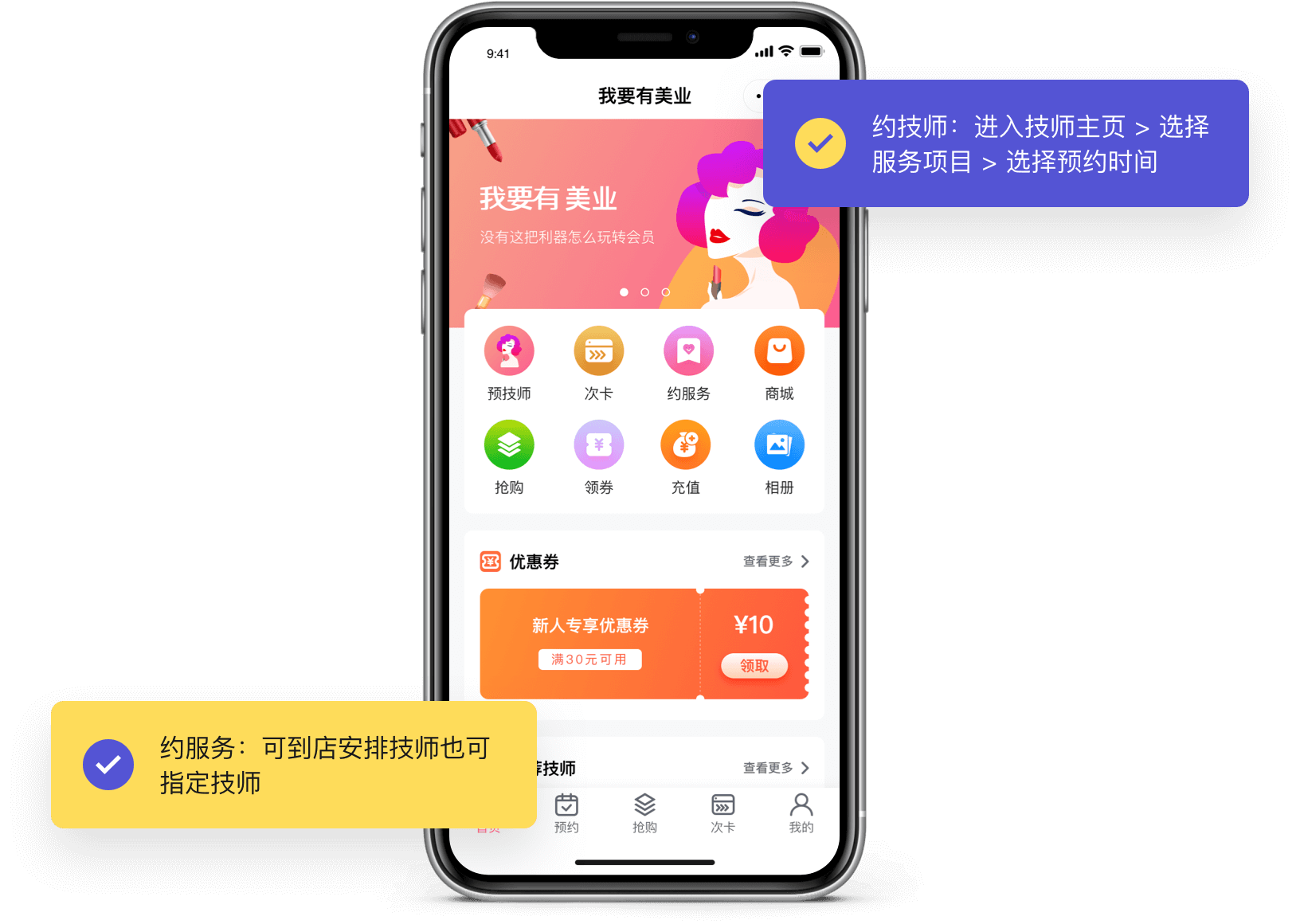 灵活的在线预约,约技师和约服务,办次卡,购买服务,完善的小程序店铺,技师主页、绝佳的体验,坐拥微信10亿流量。
